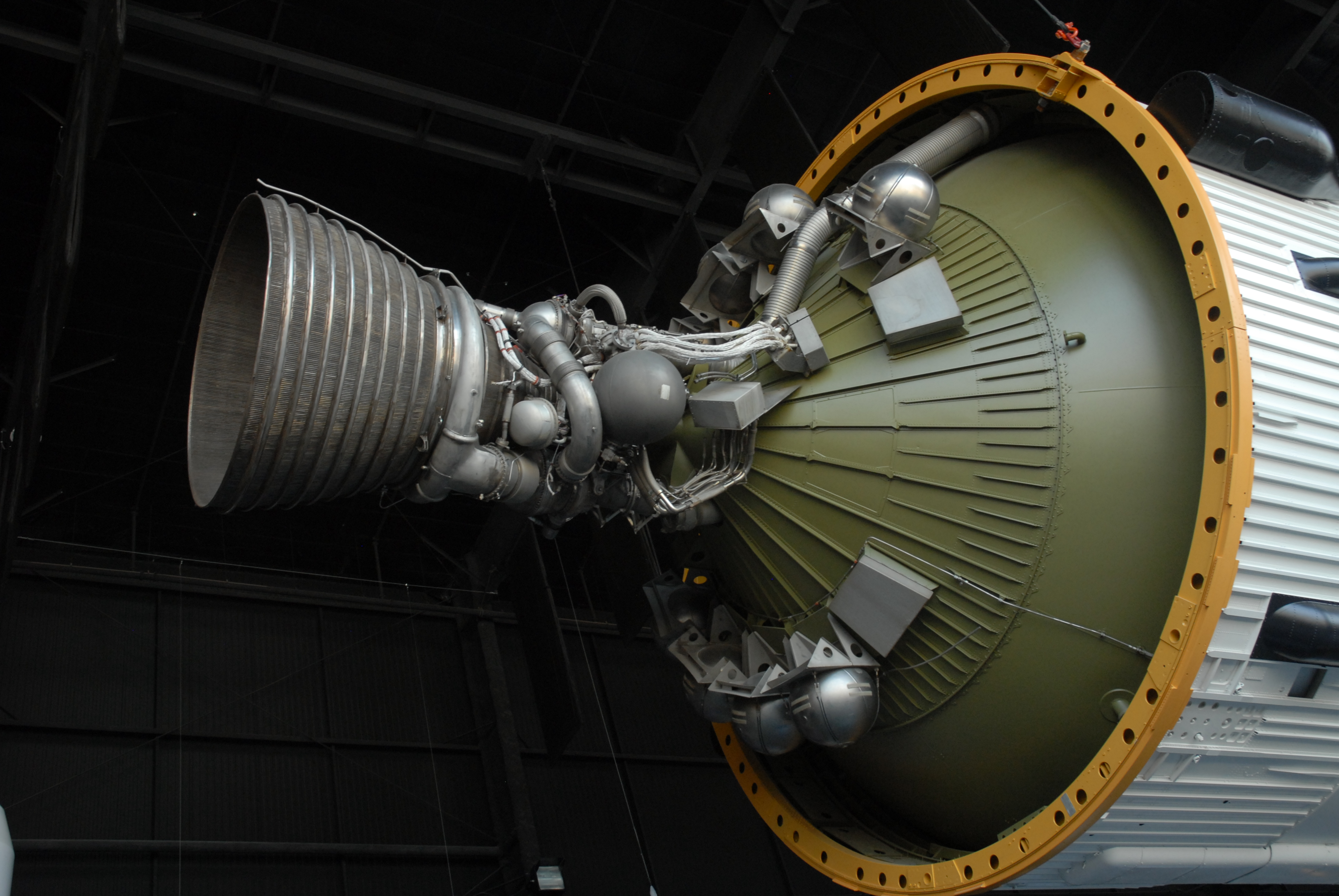 This is a more detailed view of the Saturn V F-1 engine. The large pipe that wraps around the exit orifice of the nozzle is the exhaust of the pump turbines. The turbine exhaust gas was dumped into the thrust chamber. | ||