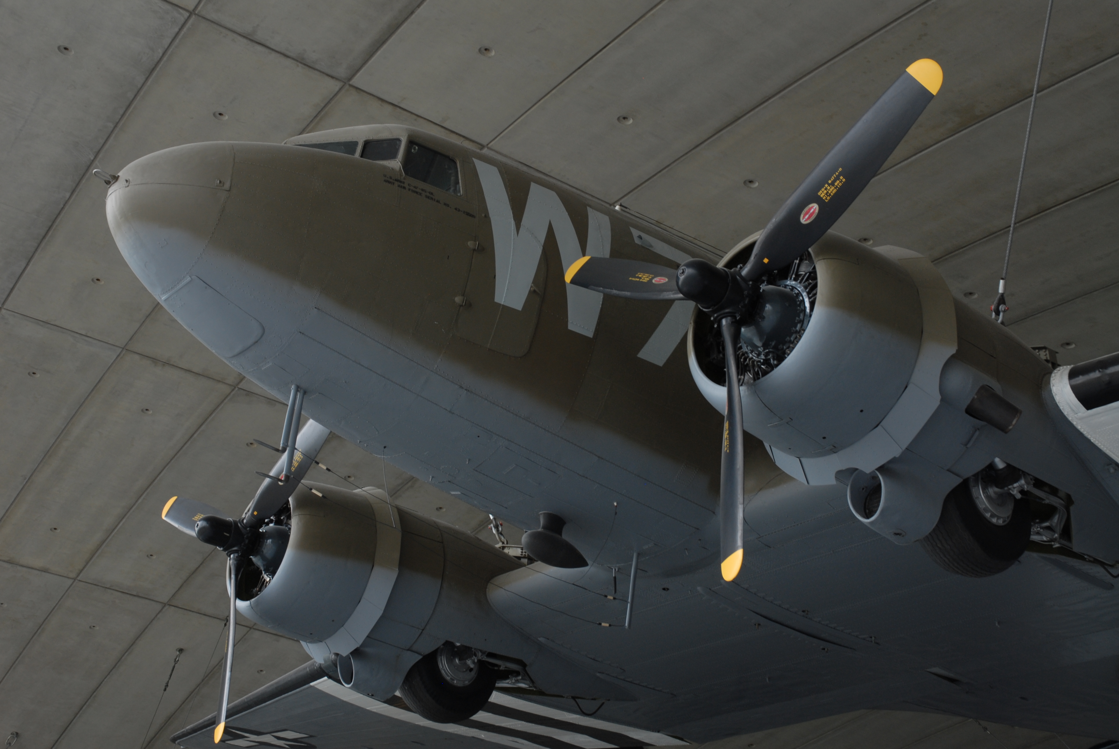 Douglas C-47 Skytrain. Crew of 4; Two 1,200 hp Pratt & Whitney R-1830 piston engines. The C-47 is the military version of the DC-3 and became the most widely-used transport aircraft. This aircraft is C-47A-85-DL. |